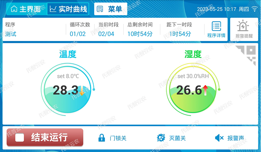 運行狀態(tài):可查看溫度、濕度,程序、循環(huán)次數(shù)、時段、剩余時間等。