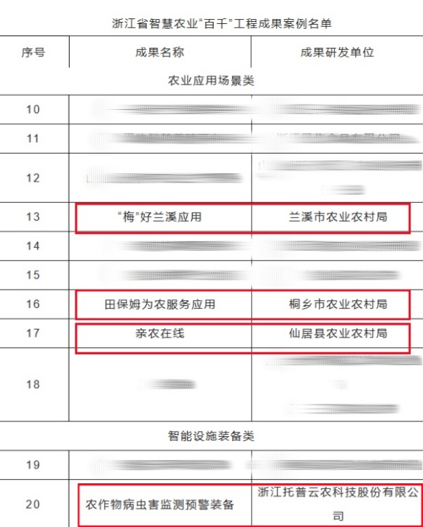 近日,浙江省農(nóng)業(yè)農(nóng)村廳公布了2023年度浙江省智慧農(nóng)業(yè)“百千”工程成果案例。其中,由浙江托普云農(nóng)科技股份有限公司(下稱“托普云農(nóng)”)自主研發(fā)的“農(nóng)作物病蟲害智慧測(cè)報(bào)系統(tǒng)”成功入選智慧設(shè)施裝備類案例;托普云農(nóng)全資子公司——浙江森特技術(shù)支撐建設(shè)的“梅”好蘭溪應(yīng)用、田保姆為農(nóng)服務(wù)應(yīng)用、親農(nóng)在線成功入選農(nóng)業(yè)應(yīng)用場景類案例。