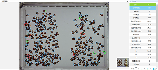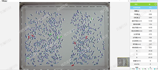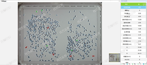 TPKZ-3可分析單粒種子的粒型參數(shù)(長、寬、長寬比、面積、周長、顏色);所有種子的總粒數(shù)、千粒重、百粒重、顏色分析、平均值(長、寬、長寬比、面積、周長、標(biāo)準(zhǔn)差)
