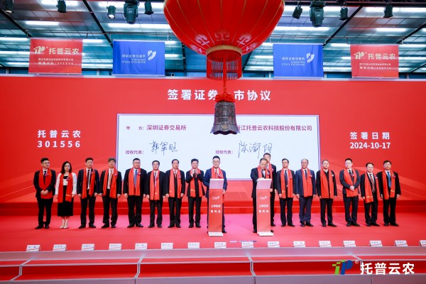 2024年10月17日,隨著深圳證券交易所儀式大廳的鐘聲響起,浙江托普云農(nóng)科技股份有限公司(股票簡(jiǎn)稱:托普云農(nóng),股票代碼:301556)正式在深交所創(chuàng)業(yè)板鳴鐘上市!