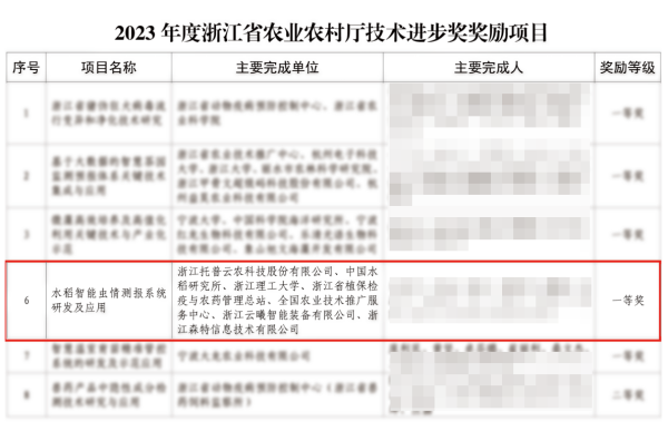 近日,加快建設(shè)創(chuàng)新浙江因地制宜發(fā)展新質(zhì)生產(chǎn)力動員部署會暨全省科學(xué)技術(shù)獎勵大會在杭州舉行。大會公布并表彰了2023年度浙江省科學(xué)技術(shù)獎。其中,由浙江托普云農(nóng)科技股份有限公司(股票簡稱:托普云農(nóng),股票代碼:301556)牽頭完成的《水稻智能蟲情測報系統(tǒng)研發(fā)及應(yīng)用》成果榮獲2023年度浙江省科學(xué)技術(shù)進步獎三等獎。這是該項成果繼榮獲“2023年度浙江省農(nóng)業(yè)農(nóng)村廳技術(shù)進步獎一等獎”之后斬獲的第二個重磅獎項,充分展現(xiàn)了托普云農(nóng)在農(nóng)業(yè)科技創(chuàng)新領(lǐng)域的卓越實力。